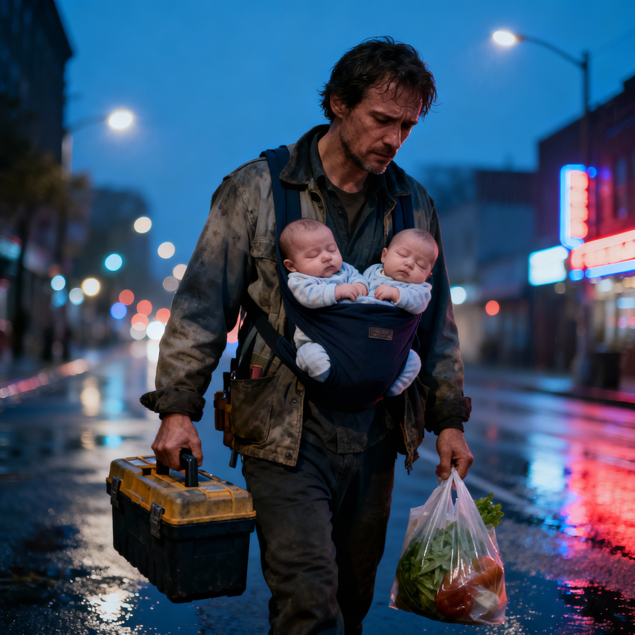 Solo era un padre cansado, caminando a casa con una caja de herramientas en una mano, las compras en la otra, y dos bebés sujetos a su pecho después de que su madre los abandonara.