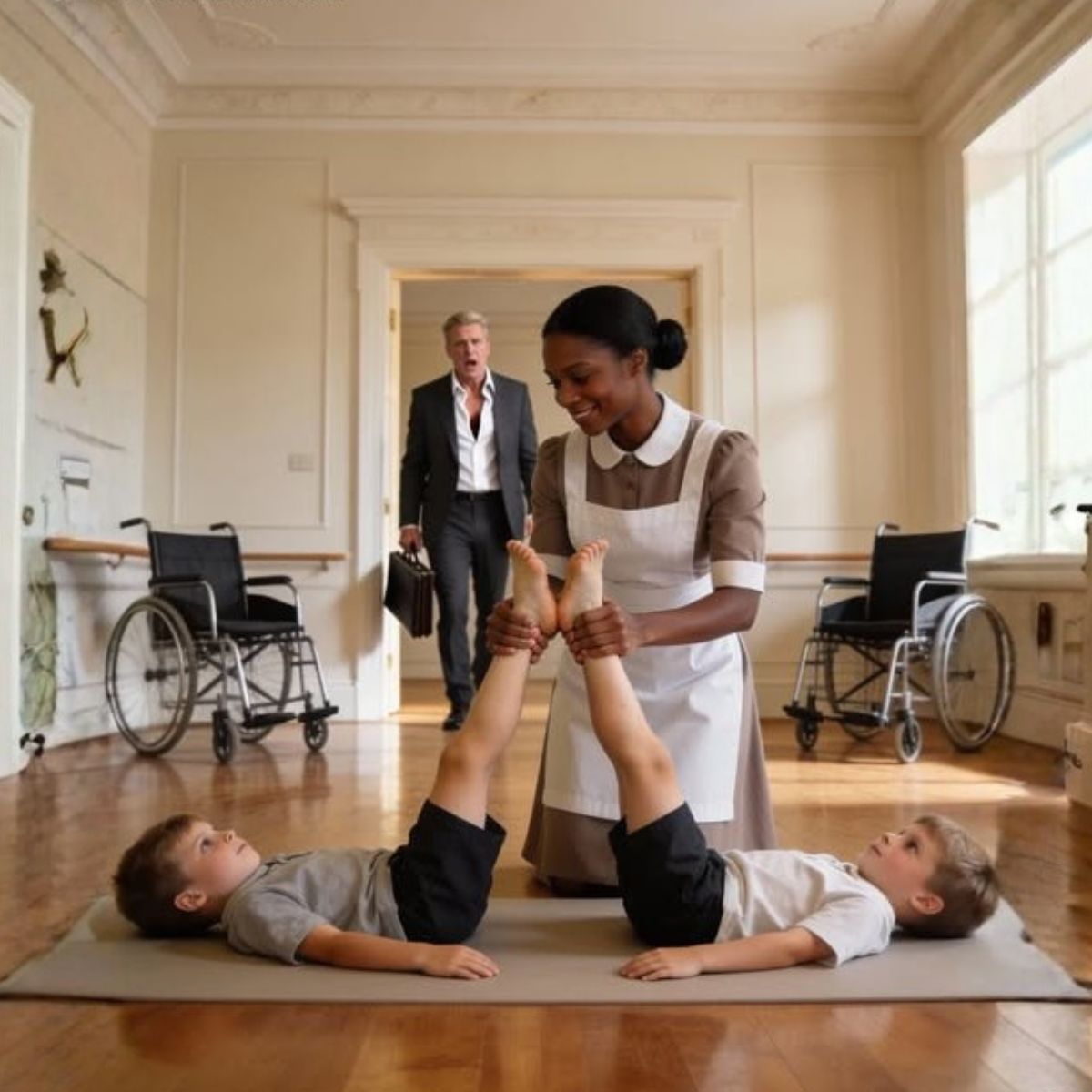 El multimillonario llegó sin avisar y vio a la empleada doméstica con sus gemelos paralizados. Lo que vio lo dejó en shock.