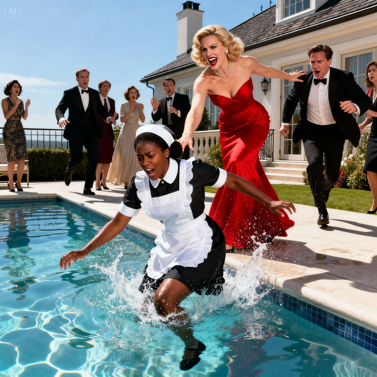 Una pobre camarera es empujada a la piscina mientras todos se ríen y la desprecian;...
