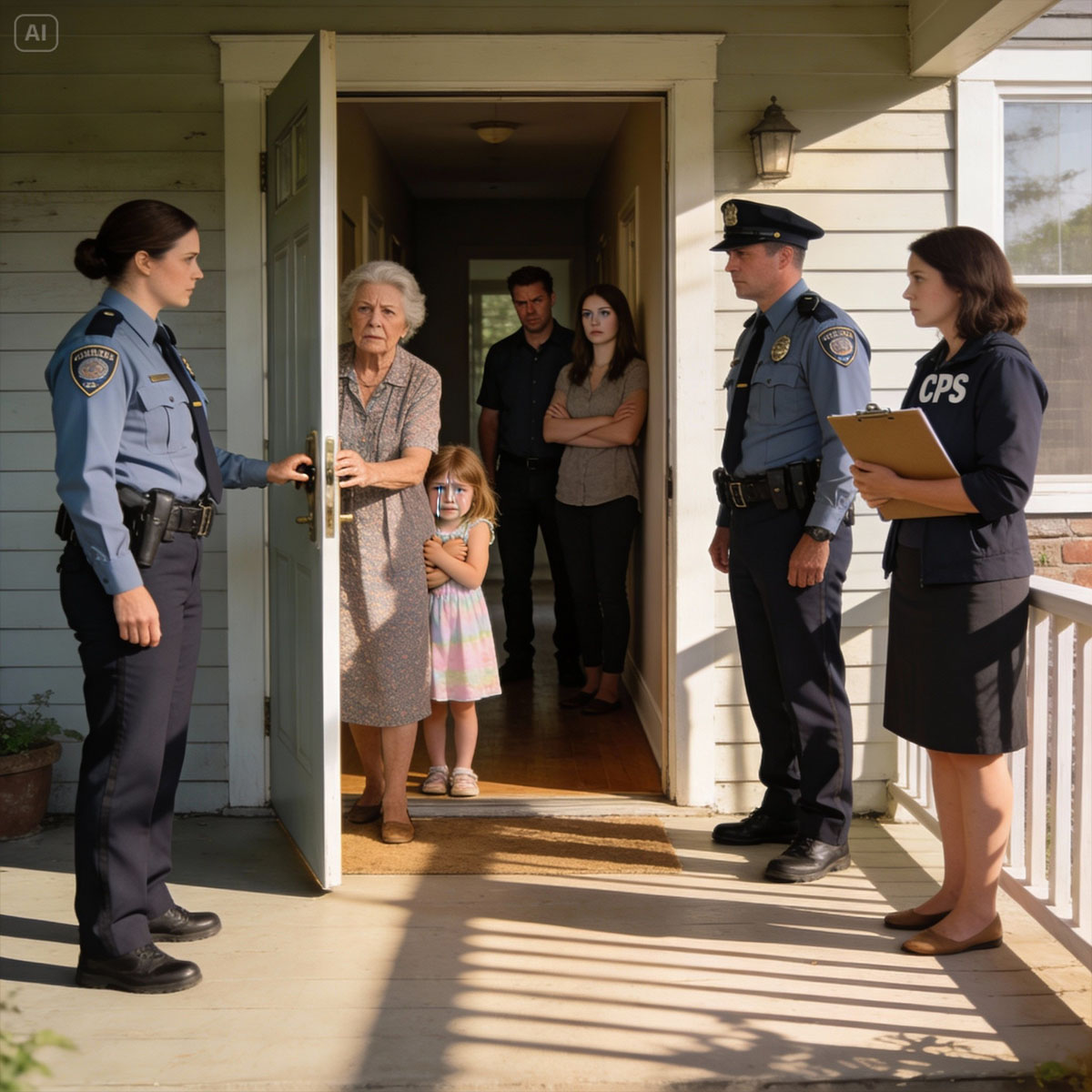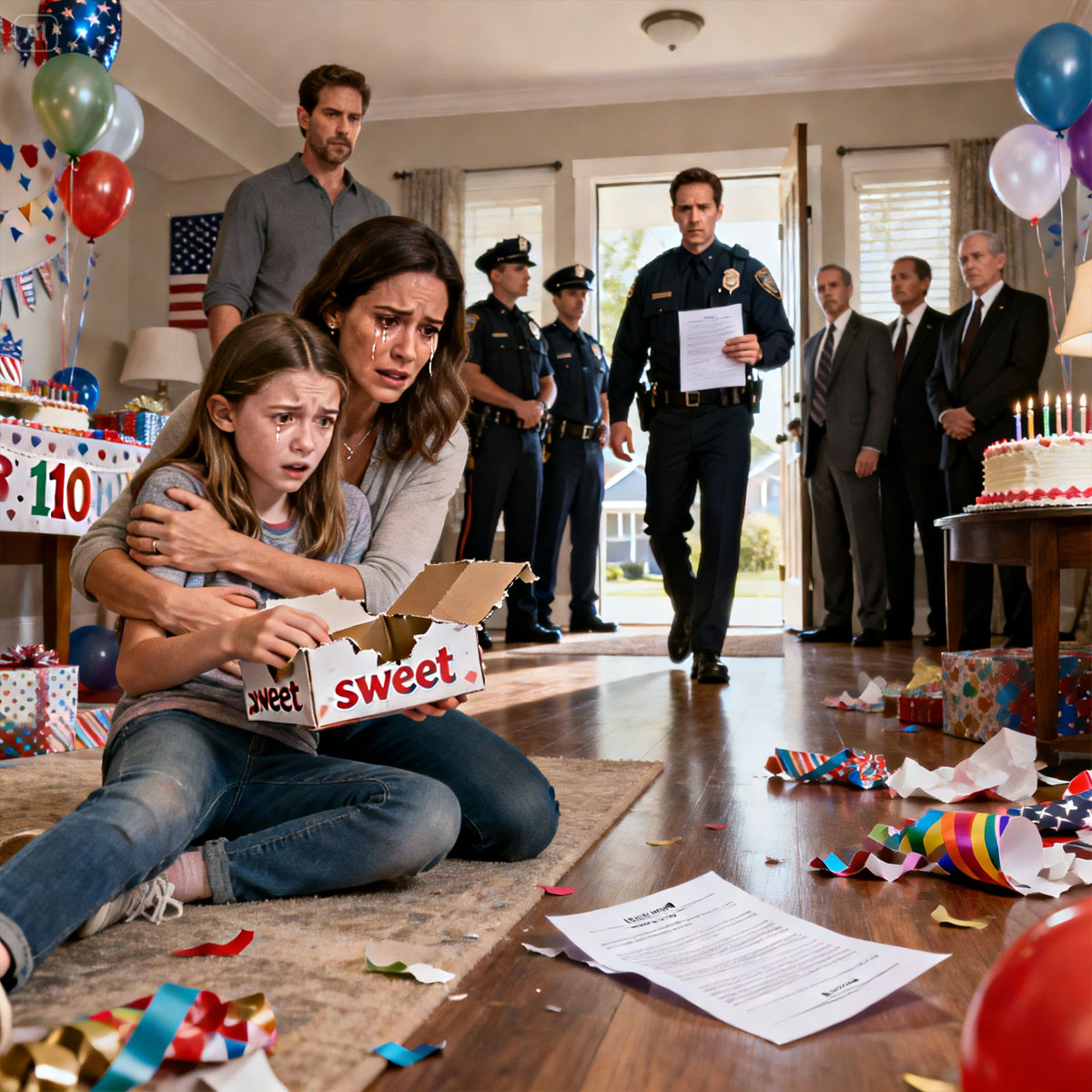En el cumpleaños número 11 de mi hija, ella rasgó el envoltorio del “dulce” regalo de mi suegra y luego se desplomó en mis brazos. Mi esposo la llevó de urgencia al hospital, pero cuando regresó cuatro horas después, no estaba solo. Cinco policías. Cuatro abogados. Él no podía mirarme a los ojos. “No entres en pánico”, dijo con la voz temblorosa. El oficial al mando dio un paso al frente: “Señora… necesitamos que nos acompañe”. Entonces vi los documentos y me di cuenta de que el regalo nunca había sido un regalo en absoluto…