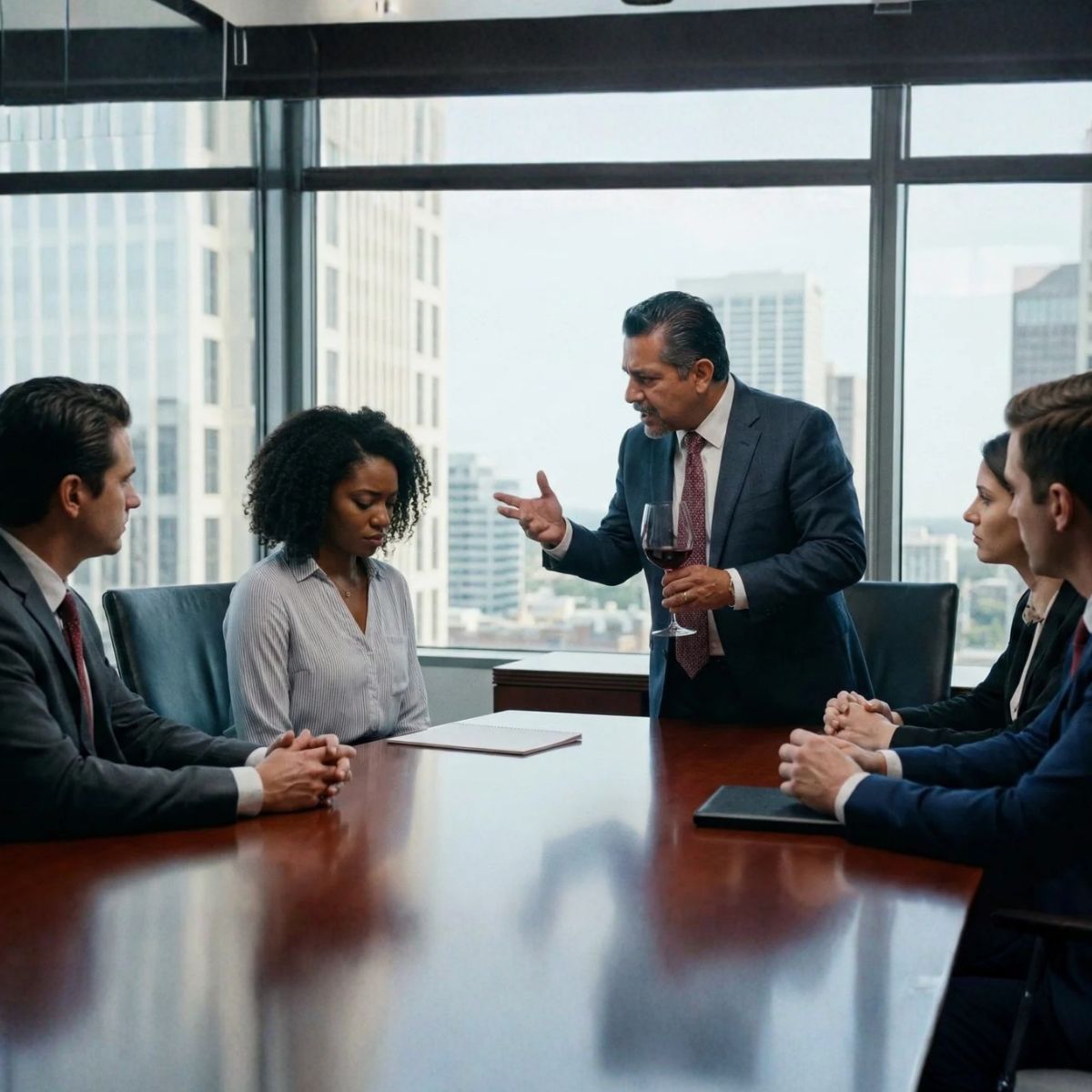 Mi esposo creyó que era gracioso abofetearme la boca delante de sus compañeros de trabajo después de que hiciera una broma inofensiva. La sala quedó en completo silencio. Él se inclinó hacia mí y siseó con desprecio: «Aprende cuál es tu lugar». Yo sonreí despacio, me limpié la sangre del labio y respondí con calma: «Acabas de abofetear a la mujer equivocada». Lo que él no sabía era que cada teléfono en esa sala acababa de grabar el instante exacto en que su carrera profesional murió.
