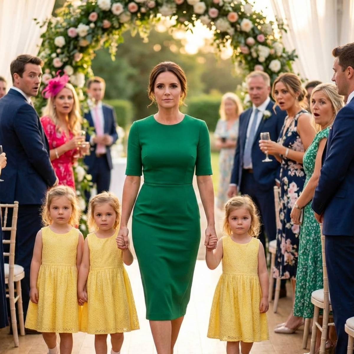 “Él la invitó a su boda para humillarla… y ella llegó en limusina con tres niñas de amarillo. En segundos, el novio perdió la sonrisa, la novia apretó el ramo y los invitados entendieron la verdad: la mujer que él despreció volvió más fuerte, más digna… y con el destino de su lado.”