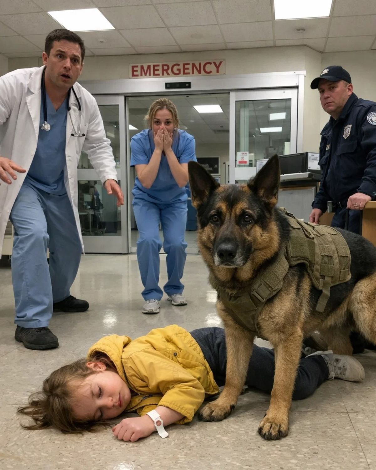 «¡Señor, no puede meter animales aquí!» — La sala de Urgencias quedó en silencio cuando un perro militar ensangrentado entró cargando a una niña moribunda. Lo que encontramos en su muñeca lo cambió todo.