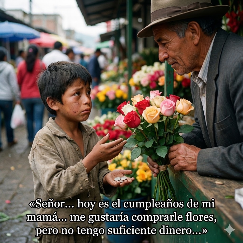 «Señor… hoy es el cumpleaños de mi mamá… me gustaría comprarle flores, pero no tengo suficiente dinero…»