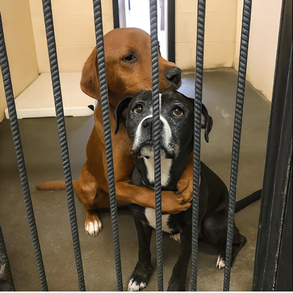 Al escuchar que los iban a sacrificar, dos perros se abrazaron y miraron orgullosos a la cámara, esperando lo mejor…