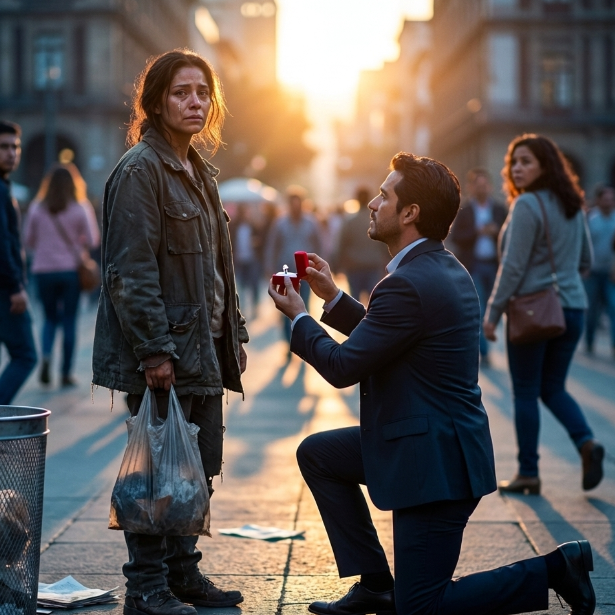 Ella buscaba comida en la calle… y un desconocido elegante se arrodilló para pedirle matrimonio frente a todos