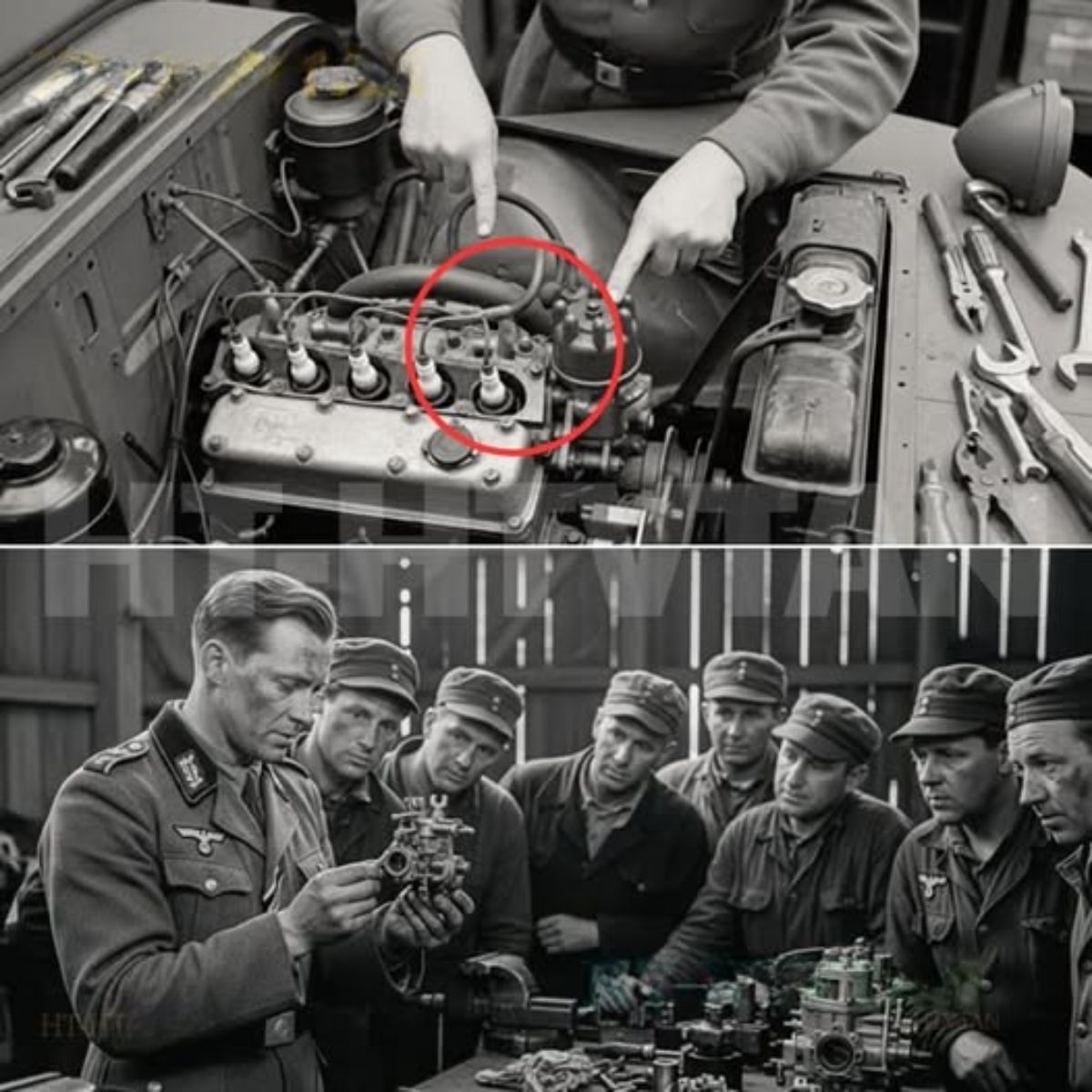 Cuando los mecánicos alemanes encontraron una pieza “imposible” en un Jeep… En un taller de una aldea capturada, un grupo de mecánicos alemanes se agolpó alrededor de un Jeep del Ejército de EE. UU. Lucía ordinario, polvoriento, abollado, solo otro vehículo enemigo dejado atrás. Habían visto camiones, tanques, incluso aeronaves estadounidenses.