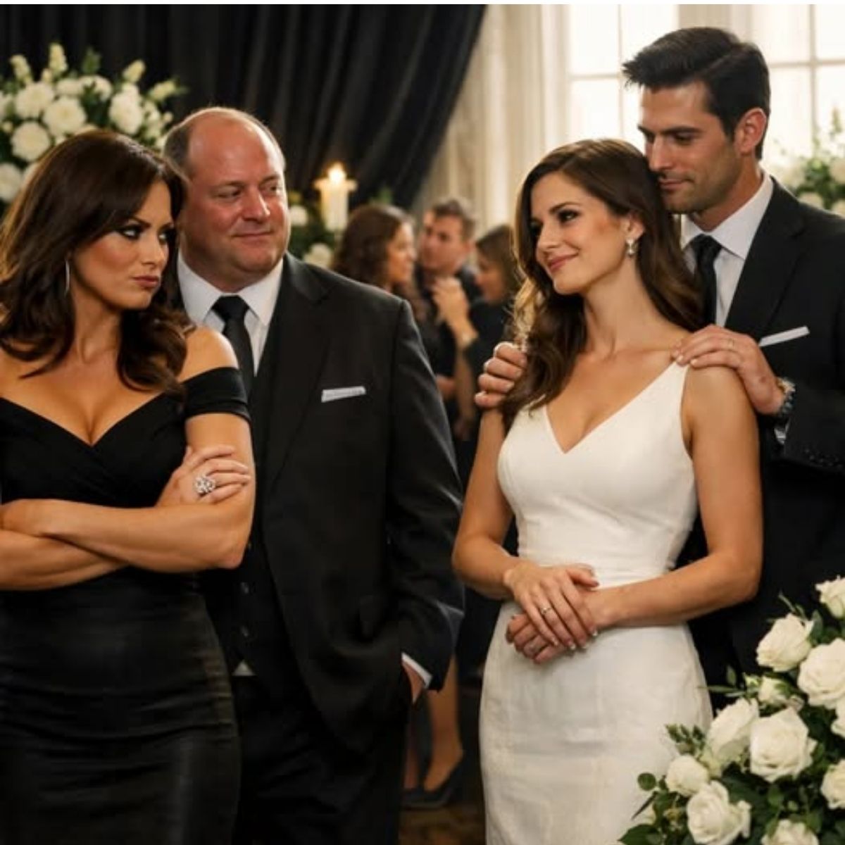 Hace seis años, mi hermana me robó a mi prometido millonario, el hombre con el que estaba a punto de casarme. Ahora, en el funeral de nuestra madre, entró con él, luciendo su anillo de diamantes, y dijo: “Pobre de ti, todavía sola a los 38. Yo me quedé con el hombre, el dinero y la mansión.” Yo sonreí, me giré hacia ella y le dije: “¿Ya conociste a mi esposo?” Cuando lo llamé para que se acercara, su rostro se puso pálido… porque en realidad, mi esposo era