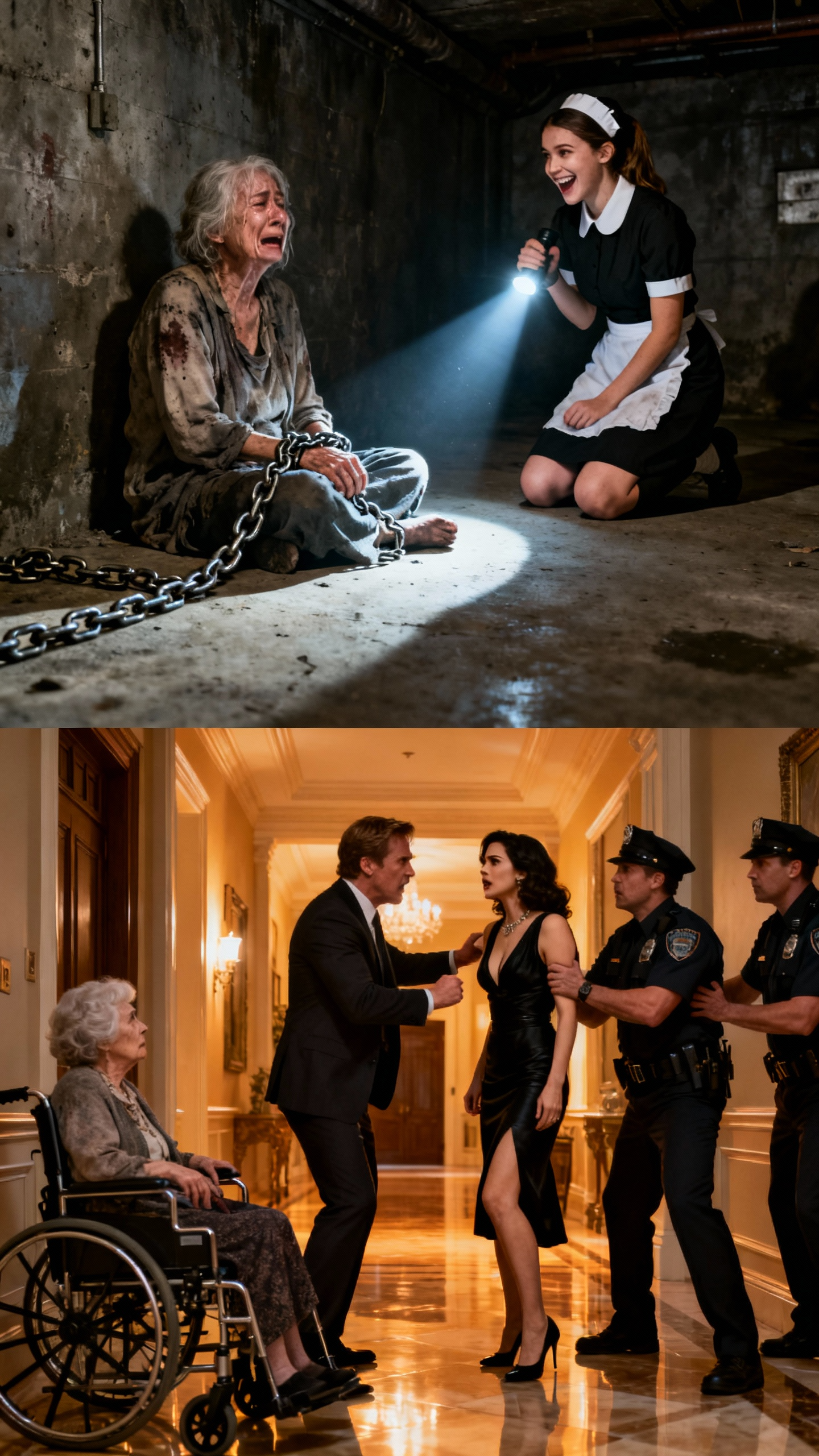 LA EMPLEADA DOMÉSTICA ESCUCHÓ UN GEMIDO EN LA “HABITACIÓN PROHIBIDA” SUBTERRÁNEA — CUANDO LA ABRIÓ, CAYÓ DE RODILLAS AL VER A LA MADRE DEL MULTIMILLONARIO ENCADENADA Y COMIENDO COMIDA PARA PERRO