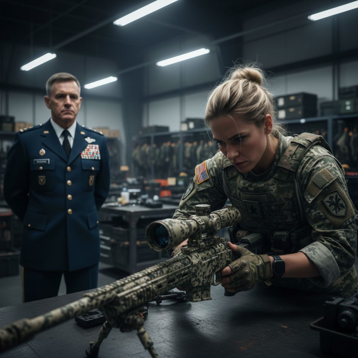 El general pasó junto a su Barrett calibre .50 — y se quedó helado al leer su insignia de francotiradora de 3.200 metros.