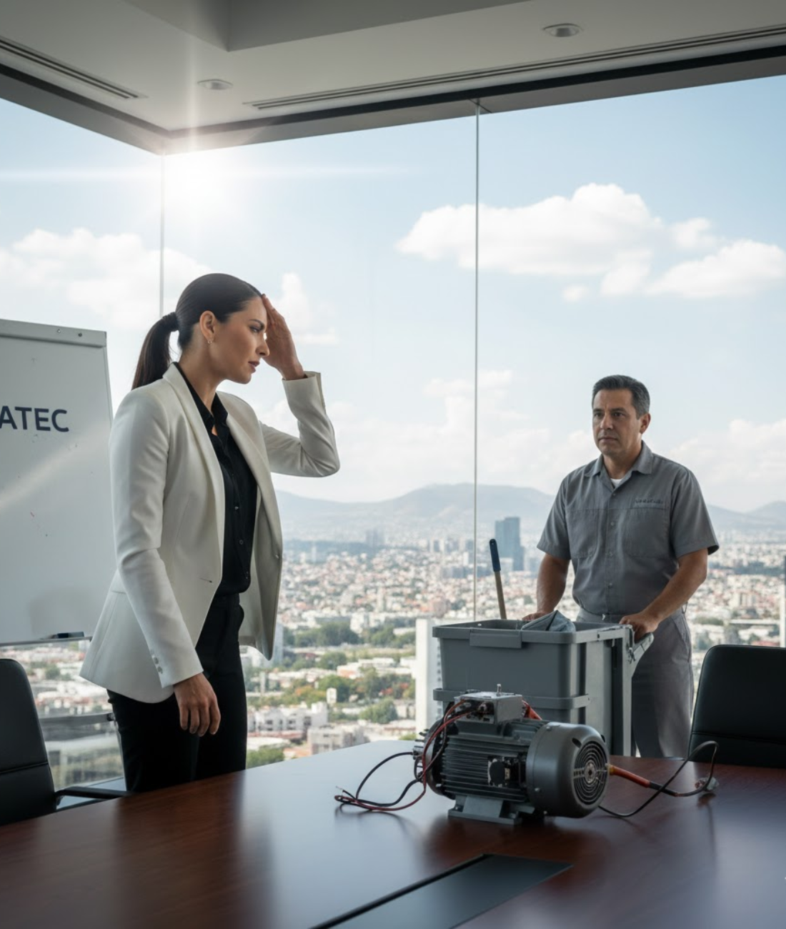 Estás de pie en la sala de conferencias de cristal del último piso de Megatec....