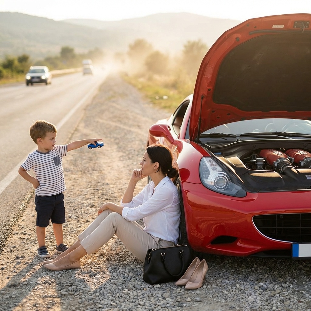 “Mi papá puede arreglarlo”, le dijo el niño a la mujer millonaria que tenía problemas con su Ferrari en la autopista.