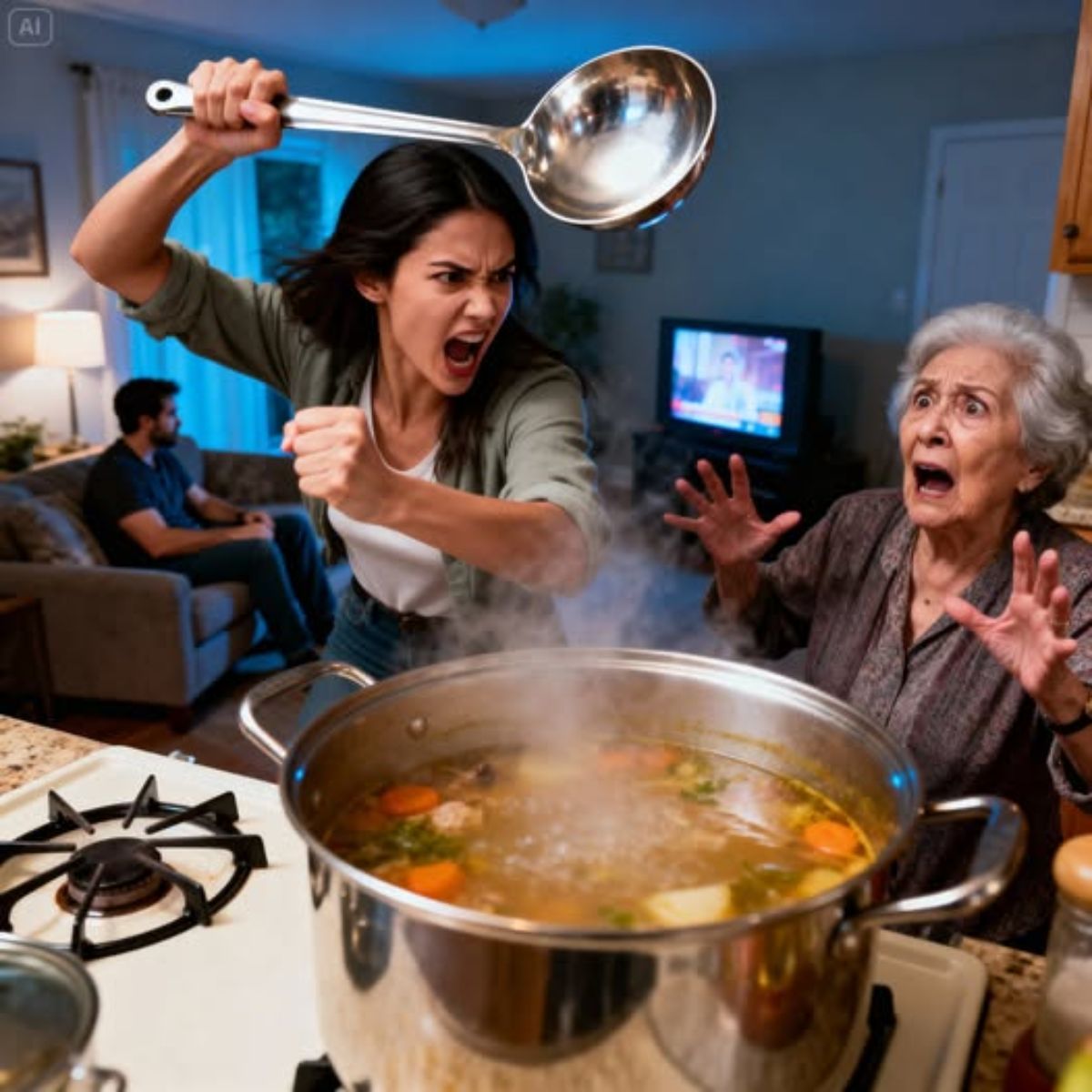 Estaba revolviendo la sopa cuando mi nuera me estrelló el cucharón en la cabeza. “¿Quién cocina así, mujer inútil?!”, gritó. Mi hijo solo subió el volumen de la televisión, fingiendo no oír. Cinco minutos después, un fuerte estruendo sacudió la cocina. Él corrió hacia allá… y se quedó paralizado al ver lo que yo había hecho.