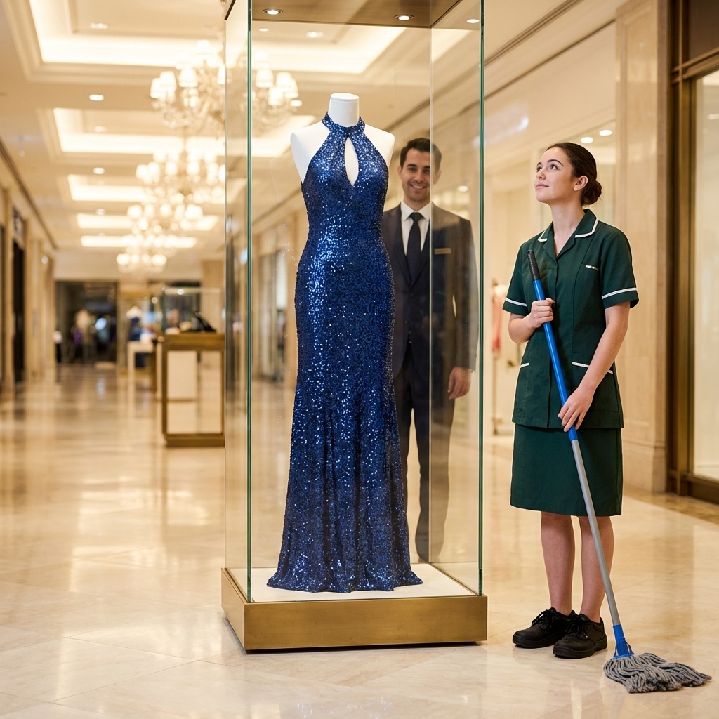 Siete años después del divorcio, se encontró con su exesposa trabajando como limpiadora—mirando en silencio un vestido de un millón de dólares