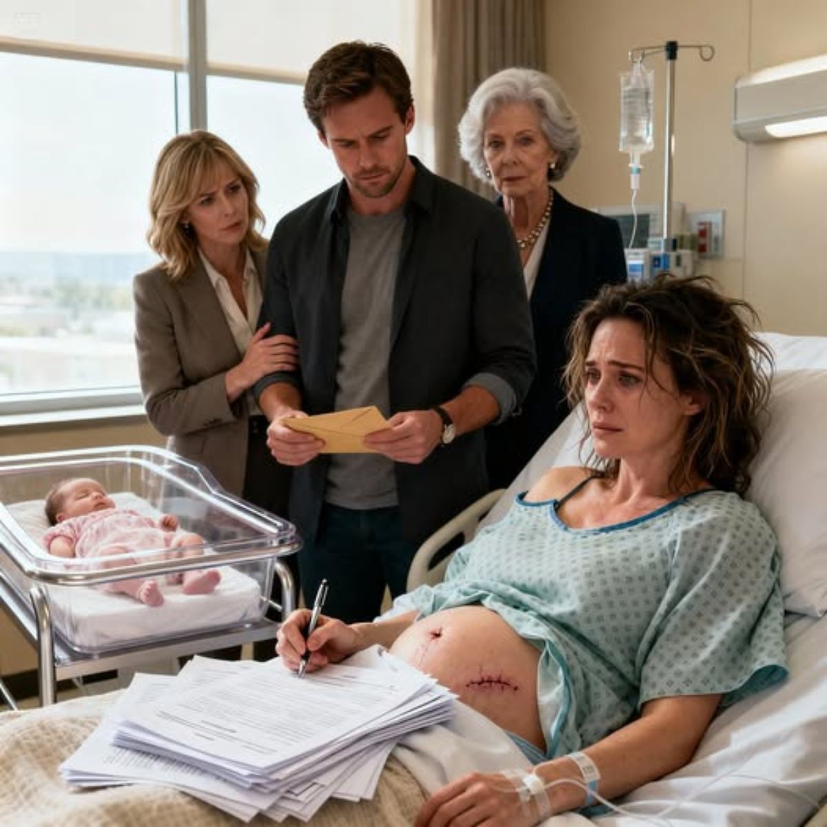 Apenas había dejado de temblar por el parto cuando mi esposo entró en mi habitación del hospital con otra mujer colgada de su brazo, como si ya perteneciera allí. Su madre lo siguió, le metió un sobre en la mano y susurró,